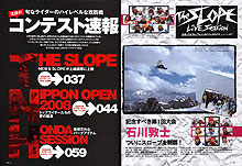 注目の3大コンテストをド、ドンとお届け。ついに大会を制した石川敦士、持ち前のスタイルで2位に入賞した國母和宏などライダー達の熱いライディングを余すところなくレポート。観に行った人はもう一度、そうでない人もこのレポートでアツくなれ! |