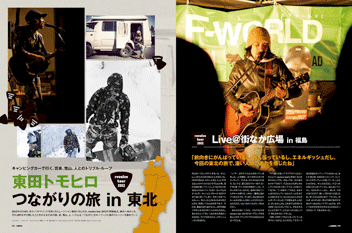ヨコノリのマインドを持った人気の音楽アーティスト、東田トモヒロがこの冬福島や宮城へのライブツアーに出かけた。キャンピングカーで東北をまわり、地元を盛り上げようと頑張っている人たちとスノーボードセッション。美しい東北を取り戻すため、人と人との繋がりを信じる東田トモヒロというひとりのアーティストに密着した。 |