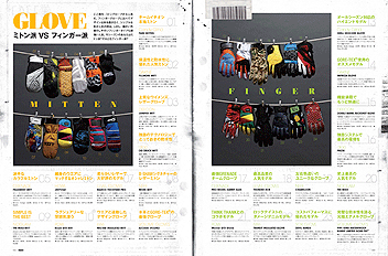 スノーボードでの必需品、グローブにもミトンブームが到来。指の割れていないミトン型のグローブは保温性もあり、ファッション的にも多くの人に支持されている。その一方でフィンガータイプのグローブも未だ根強い人気を持っている。 |