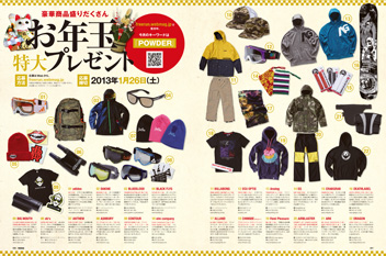2013年もよい年に!という思いも込めて超豪華商品が抽選で当たる特大お年玉プレゼントの応募をスタート!ハードギアから激レアな小物まで盛りだくさん。どしどし応募して今年の運試しをしてみよう。さらに今年はfacebookでも応募ができるのでチャンスが広がるぞ! |