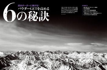 12月に入り、日本は一気に冬モードに突入!各地で大雪となり、パウダーフリークにとっては最高のシーズンがスタート。最高の雪を最高のタイミングでGETするために知っておくべきことや、パウダーを徹底的に味わうために必要な情報を、6つのINDEXにわけてお教えしよう! |