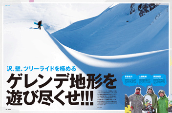 サイドカントリーという言葉を聞くようになってまだ1年ほど。しかし山滑りへ興味の対象を移行するスノーボーダーは凄く多く、ゲレンデ内でも沢や壁を滑るライダーが以前に比べて圧倒的に増えている。自分の想像力とスキルを武器に自然を乗りこなす快感をぜひ味わってほしい。 |