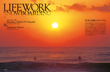 仕事と家族とヨコノリのバランスを保ちながら、スノーボーディングを高めていくライフスタイルとは?プロの最前線からショップスタッフへフィールドを移行したマグンこと林 正久と「DEATH LABEL」をドライブする大川貴文のスノーボーディングライフに迫る。 |