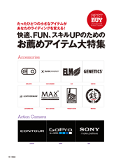 たったひとつの小さなアイテムがあなたのライディングを変えてくれる。そんなユニークなアイテムから機能的なアイテムまでたっぷり。また、近年マストアイテムとなりつつあるウエアラブルカメラもご紹介!確実にあなたのスノーボードライフスタイルを盛り上げてくれるはず。 |