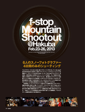 2013年2月23日から26日冬、白馬で開催されたf-stop Mountain Shootout。4日間のシューティングをおこない、最終日の夜に撮影した写真をスライドショー形式でプレゼンするというイベントだ。数々の経験を積んだ大ベテランのフォトグラファー達の写真とともに紹介しよう。 |